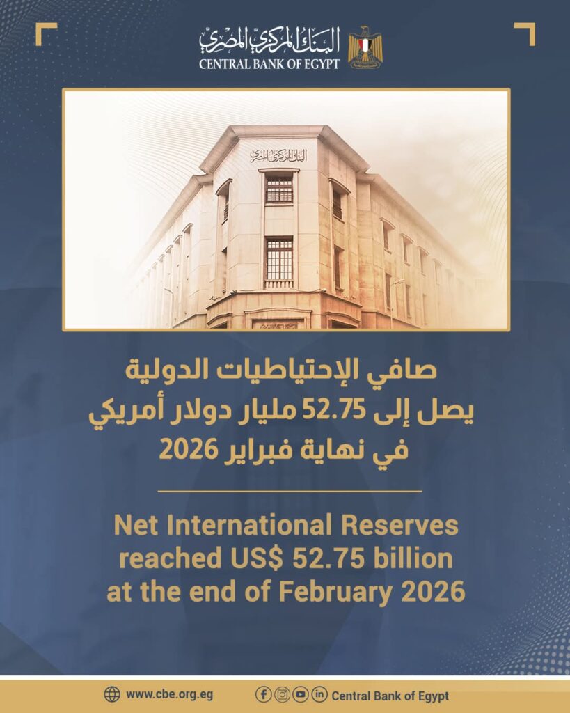 ارتفاع صافي الاحتياطيات الدولية إلى 52.75 مليار دولار بنهاية فبراير 2026.