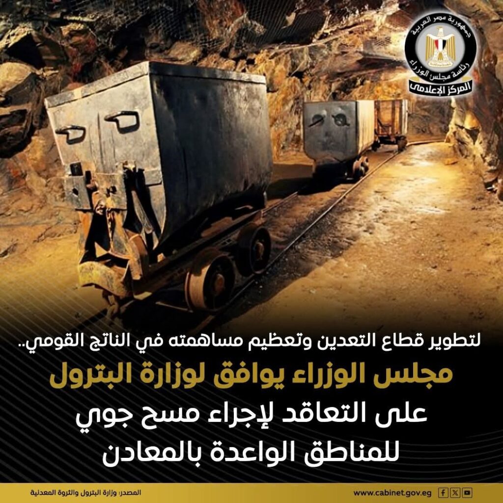 مجلس الوزراء يوافق على تنفيذ مسح جوي جيوفيزيقي شامل لأراضي مصر لتعزيز فرص الاستثمار التعديني.