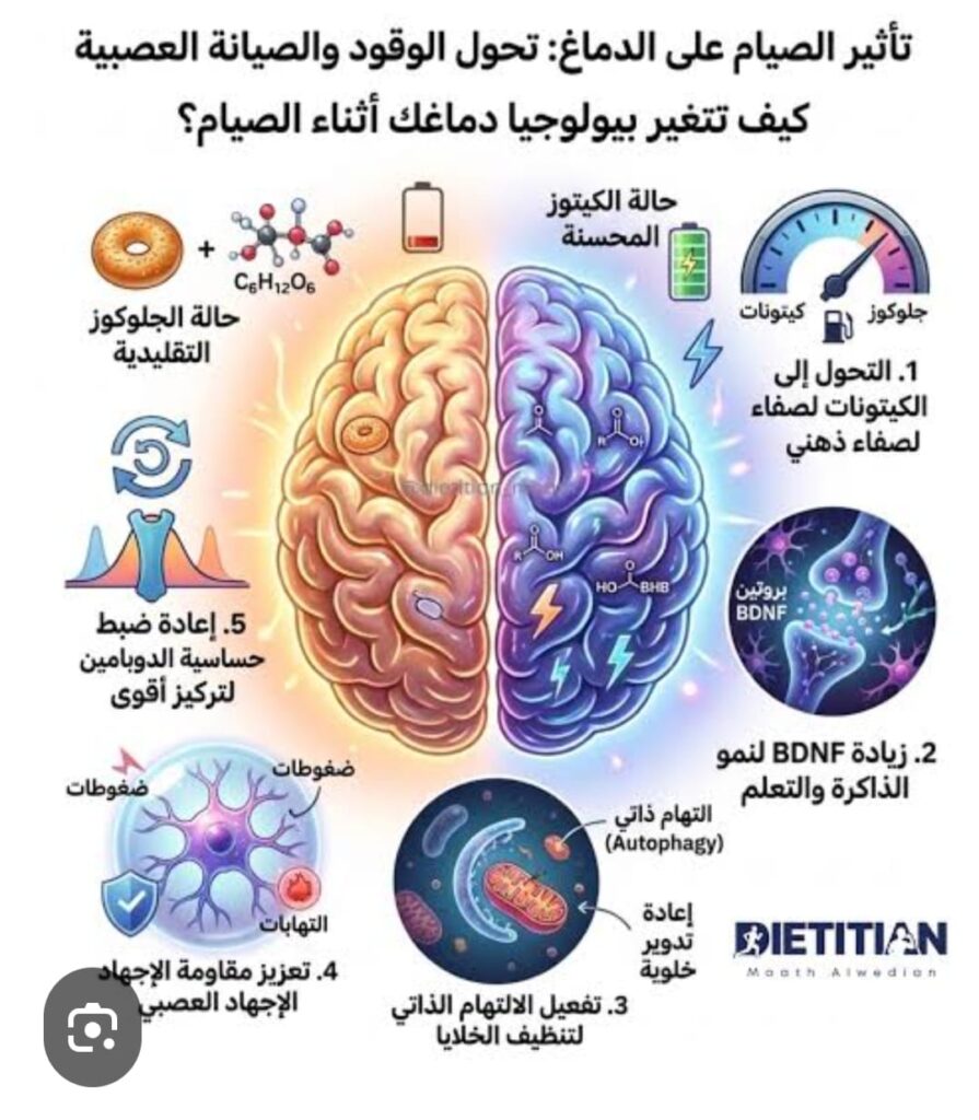 ♦تغذية وحماية الخلايا العصبية (BDNF): يرفع الصيام مستويات عامل التغذية العصبية المشتق من الدماغ (BDNF)، وهو بروتين مسؤول عن حماية ونمو الخلايا العصبية.