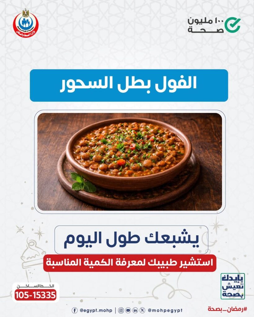 وأوضحت الوزارة أن تناول أطعمة غنية بالبروتين والألياف، مثل الفول، يساعد على تعزيز الشعور بالشبع لفترة أطول، كما يساهم في استقرار مستوى الطاقة وتقليل الإحساس بالإرهاق أثناء الصيام.