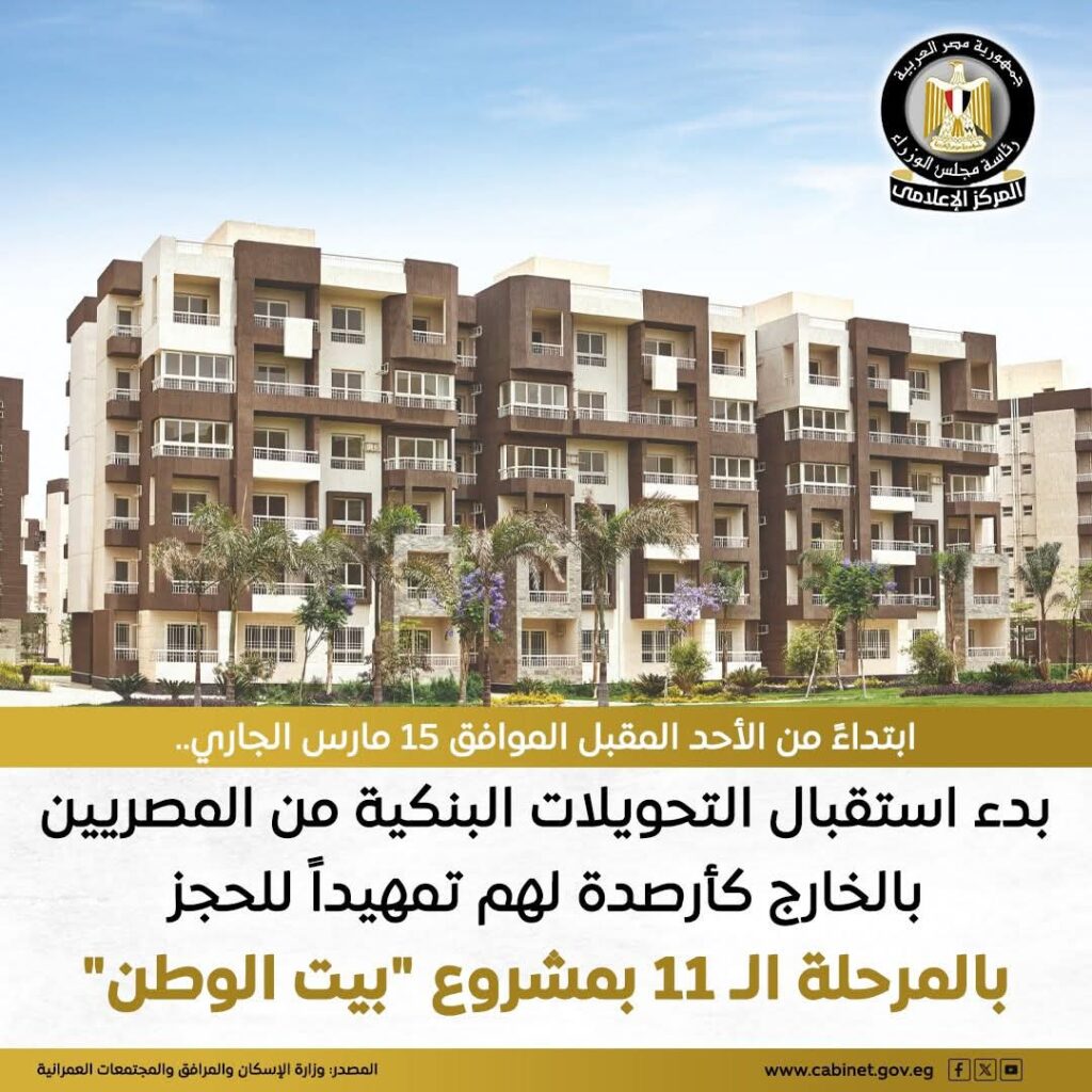 وزارة الإسكان تعلن بدء استقبال تحويلات حجز أراضي «بيت الوطن» للمصريين بالخارج اعتبارًا من 15 مارس.