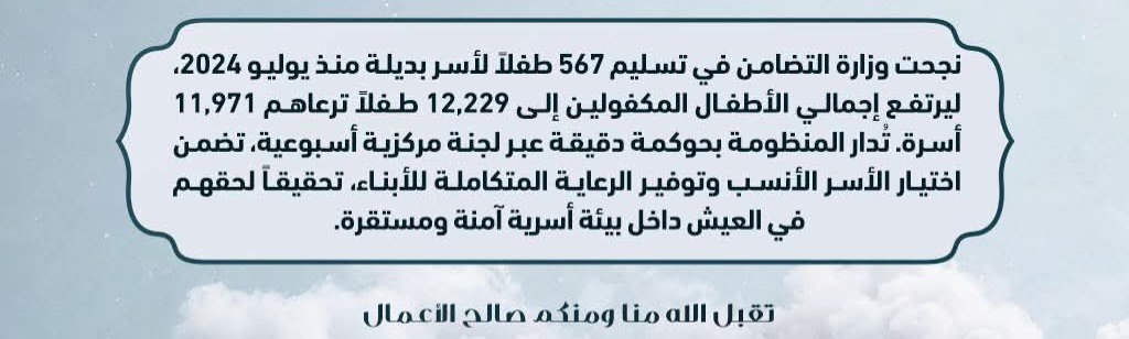 وأكدت الوزارة أن منظومة الأسر البديلة تُدار وفق حوكمة دقيقة ومنهجية منظمة، من خلال لجنة مركزية تُعقد بشكل أسبوعي لضمان اختيار الأسر الأكثر ملاءمة، وتوفير أوجه الرعاية الاجتماعية والنفسية والصحية المتكاملة للأطفال، بما يعزز فرصهم في النشأة داخل بيئة أسرية آمنة ومستقرة.