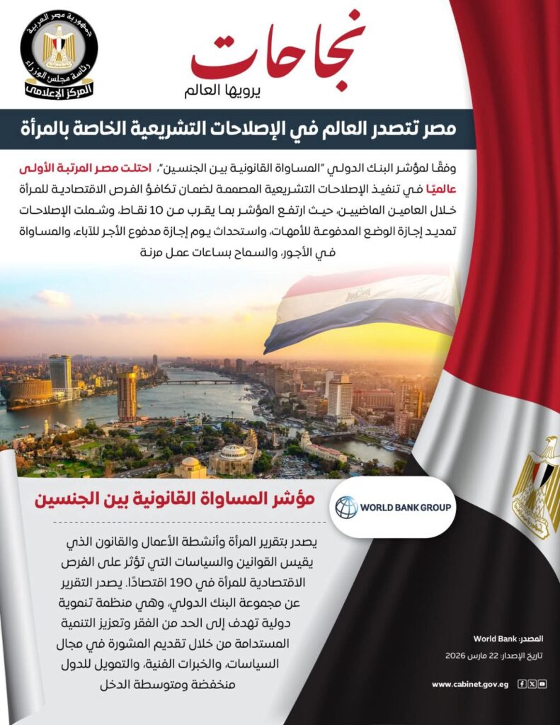 في ظل إيمان الدولة المصرية بأن الاستقرار والتقدم لا يتحققان إلا من خلال مشاركة المرأة في جميع أوجه العمل الوطني، نفذت العديد من الإصلاحات التي ترسخ المساواة في الحقوق والتكافؤ في الفرص بين الجنسين، وتقضي على كافة أشكال التمييز ضد المرأة، مع تغيير الثقافة المجتمعية تجاهها، بما يضمن كفالة الحقوق الأساسية والحماية والرعاية للمرأة، وقد أسهمت هذه السياسات في تعزيز النظرة الدولية الإيجابية لوضع المرأة المصرية، حيث احتلت مصر المرتبة الأولى عالميًا في تنفيذ الإصلاحات التشريعية لضمان تكافؤ الفرص الاقتصادية للمرأة خلال العامين الماضيين، وفقًا لمؤشر البنك الدولي “المساواة القانونية بين الجنسين”.