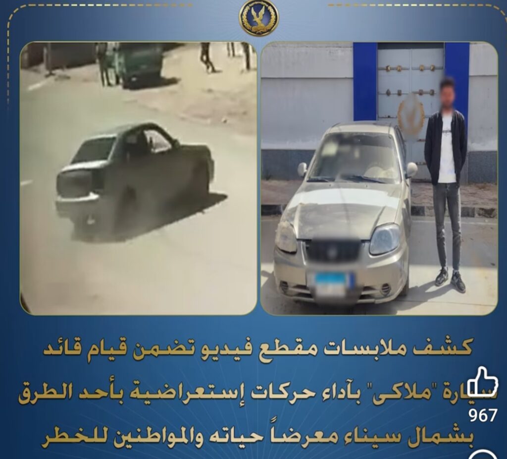 وبالفحص، أمكن تحديد وضبط السيارة الظاهرة بمقطع الفيديو، وتبين أنها سارية التراخيص، كما تم ضبط قائدها، وتبين أنه عامل ومقيم بدائرة قسم شرطة الشيخ زويد.