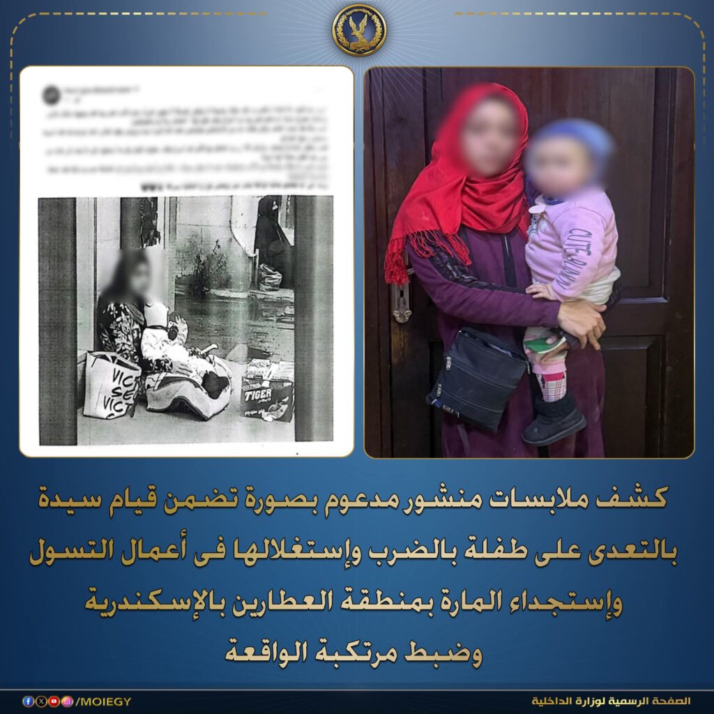 فى إطار كشف ملابسات منشور مدعوم بصورة تم تداوله بمواقع التواصل الإجتماعى تضمن قيام سيدة بالتعدى على طفلة بالضرب وإستغلالها فى أعمال التسول وإستجداء المارة بمنطقة العطارين بالإسكندرية.