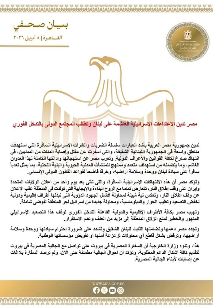 كما جددت مصر دعمها وتضامنها الكامل مع لبنان الشقيق، مؤكدةً ضرورة احترام سيادته ووحدة وسلامة أراضيه، ورفضها القاطع لأي محاولات تهدف إلى زعزعة أمنه أو تقويض مؤسساته الوطنية.