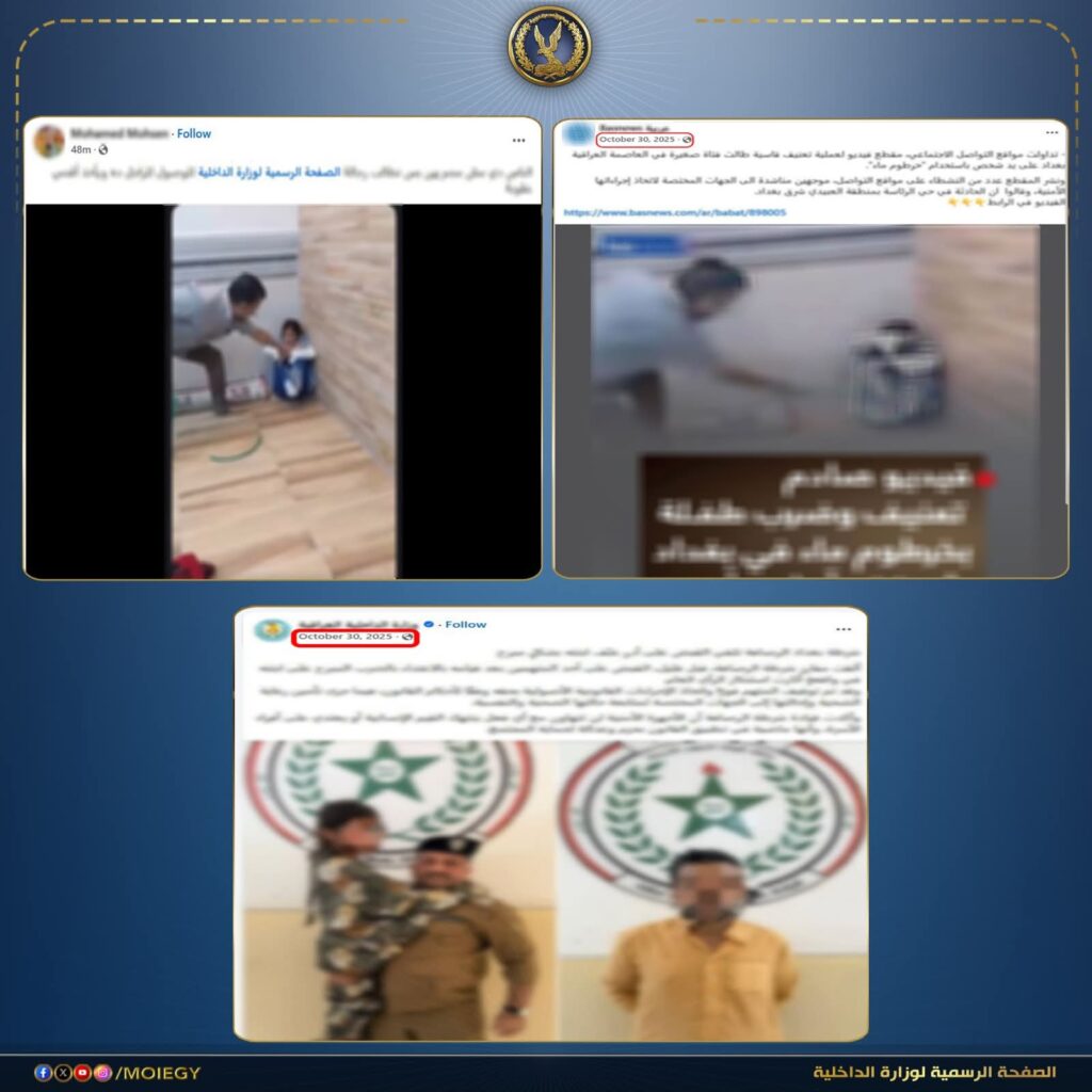 كشفت وزارةالداخلية ملابسات مقطع فيديو تم تداوله عبر عدد من الحسابات بمواقع التواصل الاجتماعي، يتضمن قيام أحد الأشخاص بالتعدي بالضرب على طفلة باستخدام خرطوم بلاستيك، مع الزعم بكون الواقعة قد حدثت داخل البلاد.