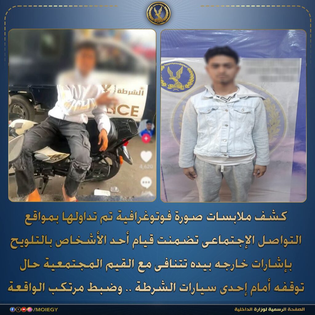 كشفت وزارة الداخلية المصرية ملابسات صورة فوتوغرافية تم تداولها عبر مواقع التواصل الاجتماعي، تضمنت قيام أحد الأشخاص بالتلويح بإشارات خارجة بيده تتنافى مع القيم المجتمعية، أثناء توقفه أمام إحدى سيارات الشرطة.