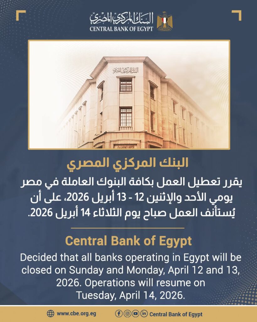 وأوضح البنك المركزي أنه من المقرر استئناف العمل بجميع البنوك صباح يوم الثلاثاء الموافق 14 أبريل 2026، عقب انتهاء الإجازة الرسمية.