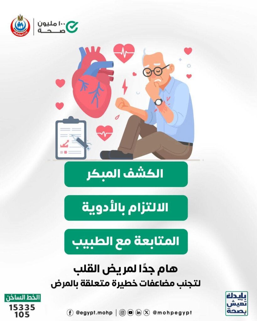 وأوضحت الوزارة أن العديد من مضاعفات أمراض القلب يمكن تجنبها من خلال خطوات بسيطة تشمل الكشف المبكر، والالتزام بالعلاج الموصوف، إلى جانب إجراء الفحوصات الدورية للاطمئنان على الحالة الصحية، خاصة للأشخاص الأكثر عرضة للإصابة بالأمراض المزمنة.