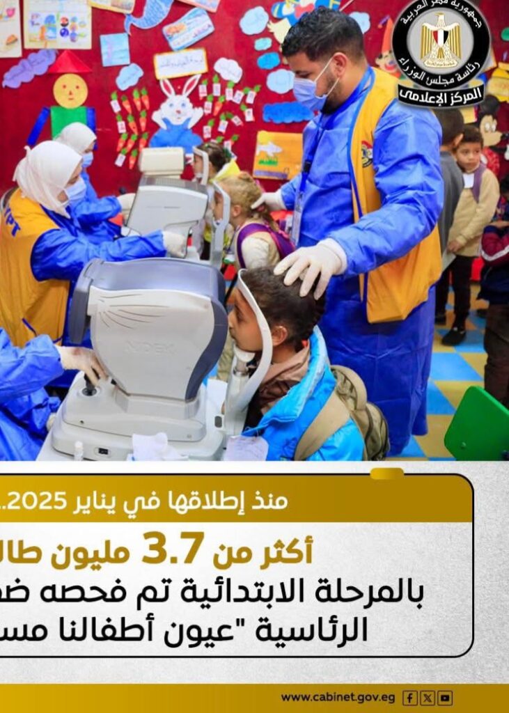 في إطار المبادرات الرئاسية “100 مليون صحة”، أعلنت وزارة الصحة والسكان عن فحص أكثر من 3.7 مليون طالب بالمرحلة الابتدائية، ضمن المرحلتين الأولى والثانية من مبادرة “عيون أطفالنا مستقبلنا”، وذلك منذ انطلاقها في يناير 2025.